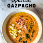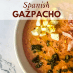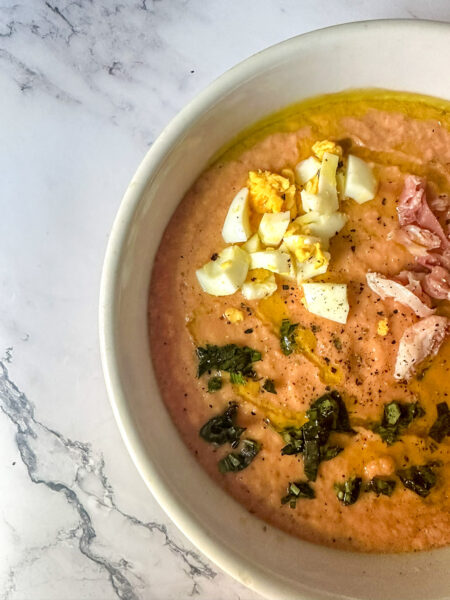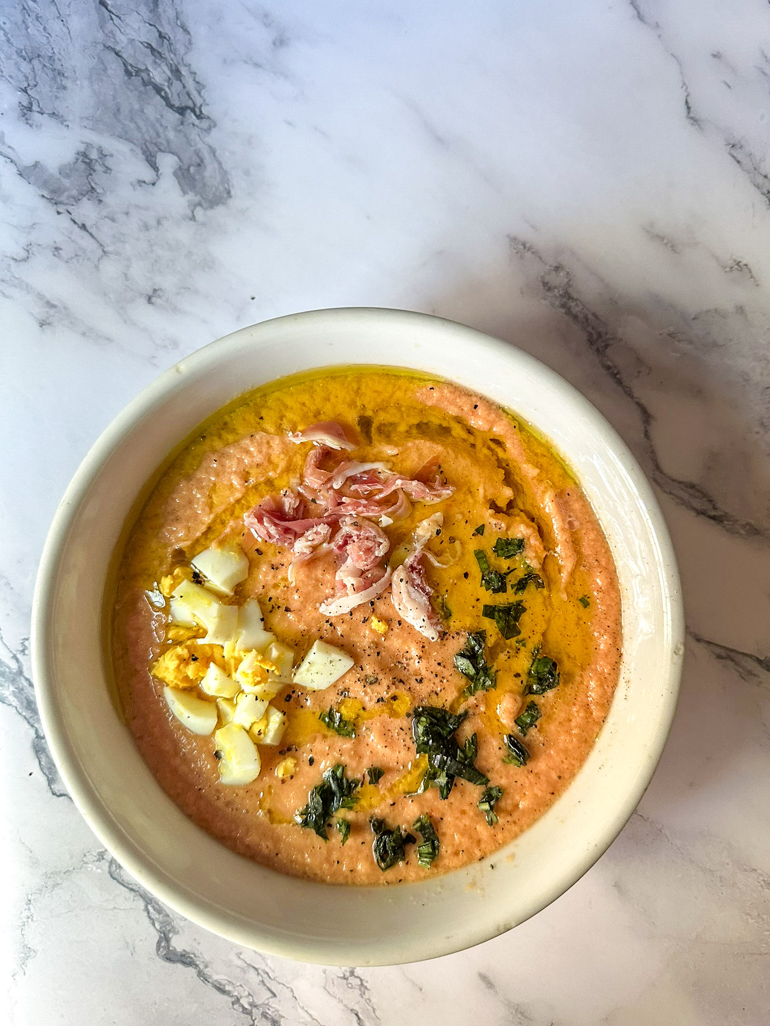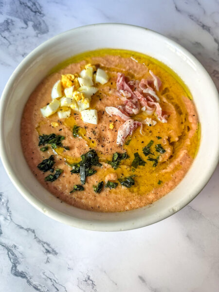 In Spain, one of my favorite things about getting a cool bowl of gazpacho to eat is the fun toppings you can add to jazz up any bowl.