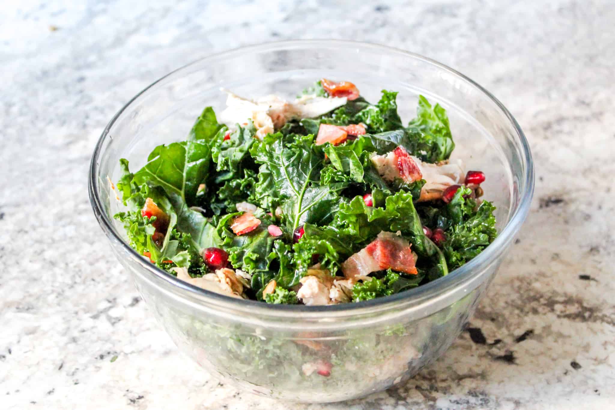 - Toss the kale leaves with the olive oil and salt in a large serving bowl. Massage the kale as much as possible- I like to take small handfuls of leaves in my hands and rub them vigorously until all the leaves have been rubbed soft.