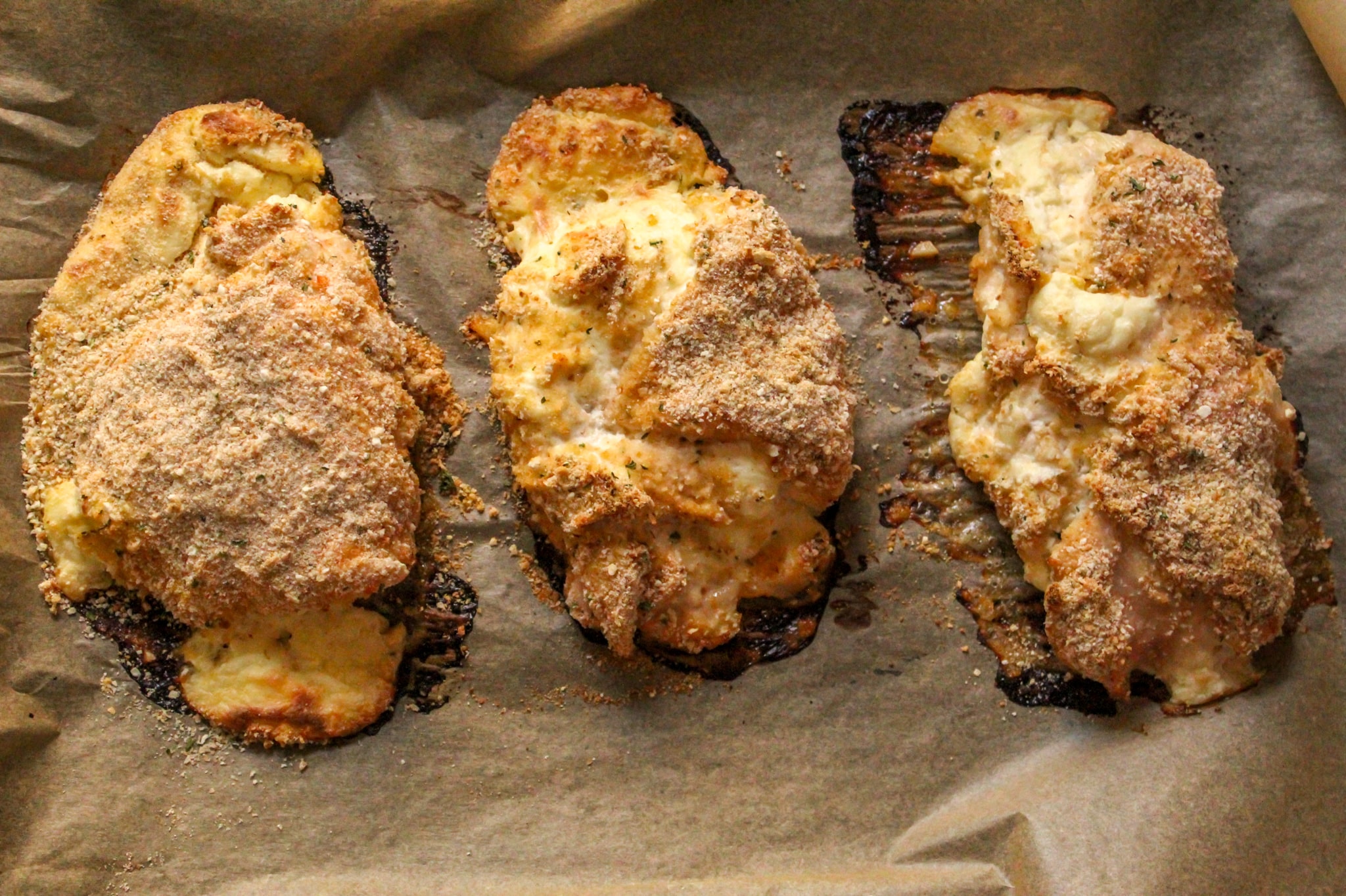 - Continue in this way with each piece of chicken, dividing the ricotta mixture evenly throughout, until all the chicken has been stuffed and breaded.