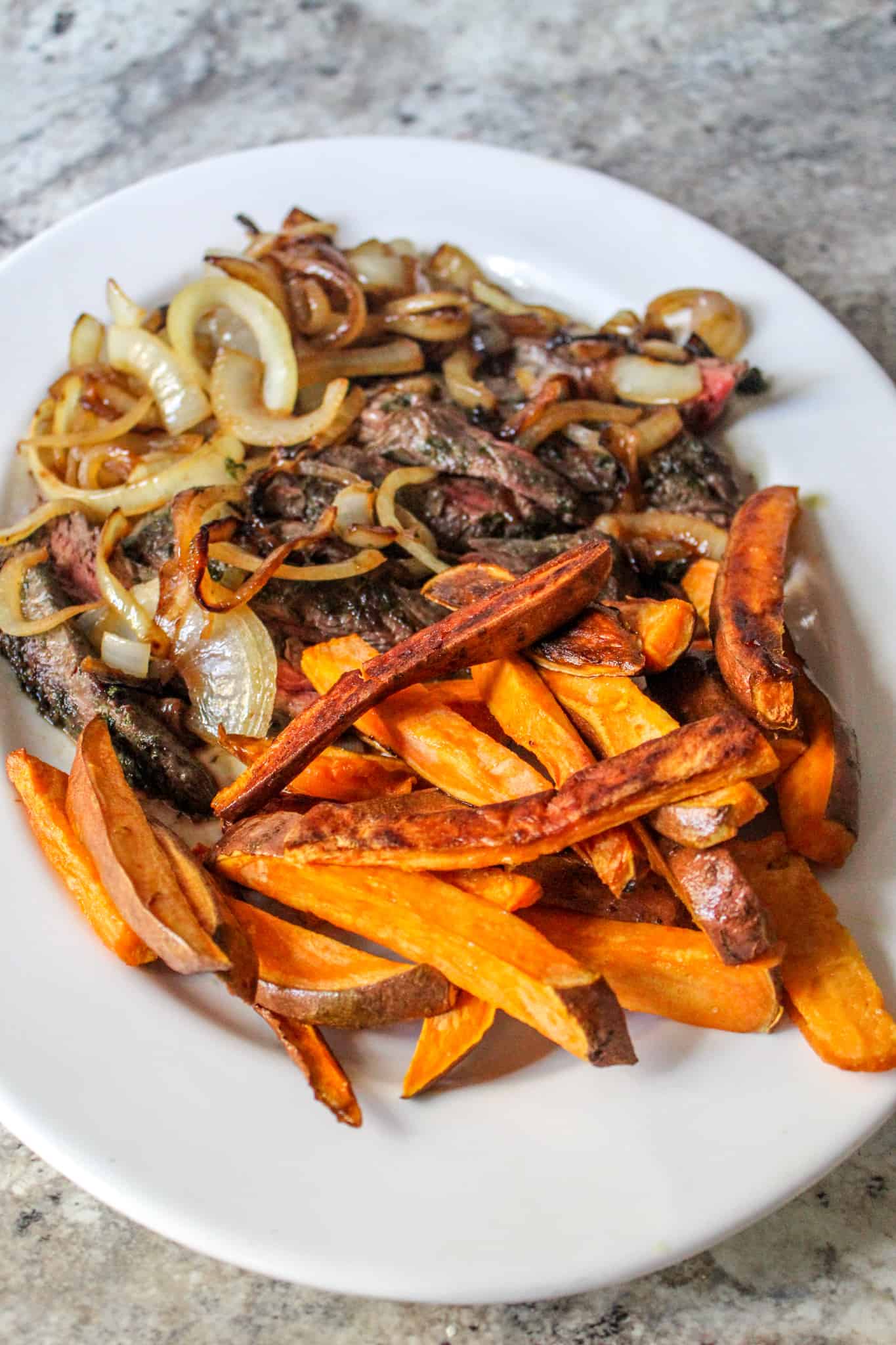 - While the onions and sweet potatoes are cooking, cook the steak.