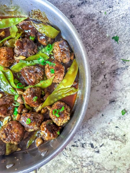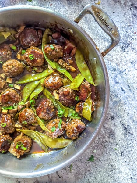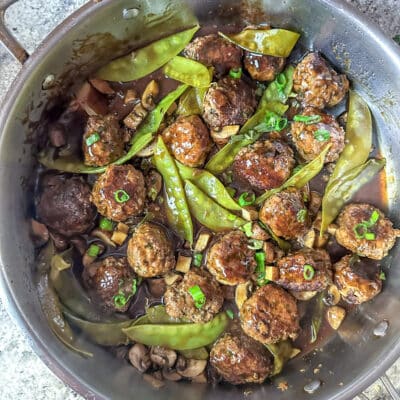 These pork meatballs give savory delicuiousness and are paired with tender mushrooms and crisp snow peas, all glazed up in a flavorful soy-based glaze. It’s like a weeknight takeout upgrade: one skillet, no tipping the delivery guy, and totally dinner party-worthy.