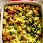 Place the pan in the oven and bake for 15-18 minutes, until the egg and cream mixture has set and the top bread cubes have browned and crisped.