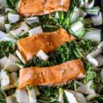 Cook the salmon pan for 10-12 minutes, until the bok choy has begun to brown and the salmon has cooked through and is flaky in the middle.