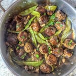 Once the meatballs have been cooked, add the snow peas and mushrooms and cook until the mushrooms have started to soften, about 2-3 minutes.